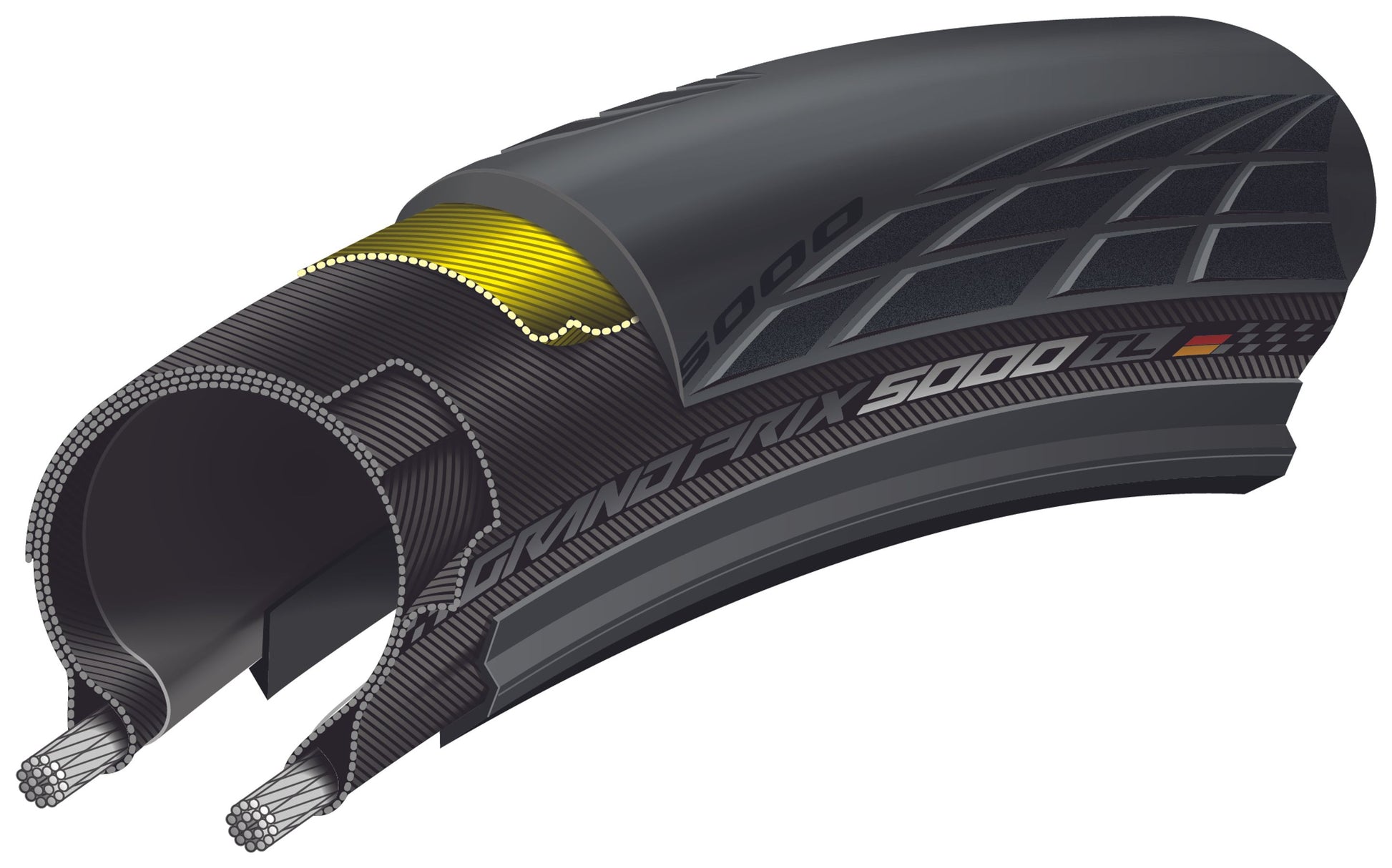 Kolmesta kerroksesta koostuva Grand Prix 5000 on suunniteltu yhdistämään suorituskyky, pito ja kestävyys unohtamatta mukavuutta. Poikkeuksellisen hyvän tienpidon takaamiseksi rengas on suunniteltu Lazer Grip -teknologialla. Tämä renkaan kyljessä olevat pienet rakenteet takaavat maksimaalisen pidon myös kaarteissa märällä tiellä. Optimaalista suorituskykyä varten Continental on uudistanut Black Chill -teknologiansa.