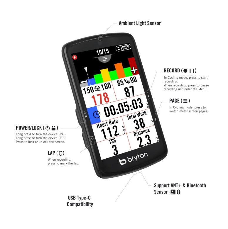 BRYTON RIDER S810E on huippuluokan GPS-pyörätietokone, joka on suunniteltu tarjoamaan pyöräilijöille suorituskykyä, tarkkuutta ja mukavuutta. Sen 3,5 tuuman värikosketusnäyttö, jossa on kirkkausanturi, mukautuu automaattisesti ympäristöön ja takaa erinomaisen luettavuuden päivällä ja yöllä. Kaiverretut, liukumattomat painikkeet takaavat optimaalisen hallinnan myös vaikeissa olosuhteissa.