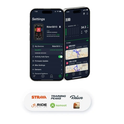 Lopuksi Rider S810E erottuu edukseen kattavan liitettävyytensä ansiosta. Bluetoothin ja ANT+:n ansiosta se tukee monenlaisia antureita: sydän-, teho-, askelmittari-, elektroninen lähetys- ja takatutka. Se synkronoituu automaattisesti Stravan, TrainingPeaksin, Komootin tai Ride with GPS:n kanssa, ja se toimii myös yhdistettyjen kotitreenien kanssa immersiivistä sisäliikuntaa varten.