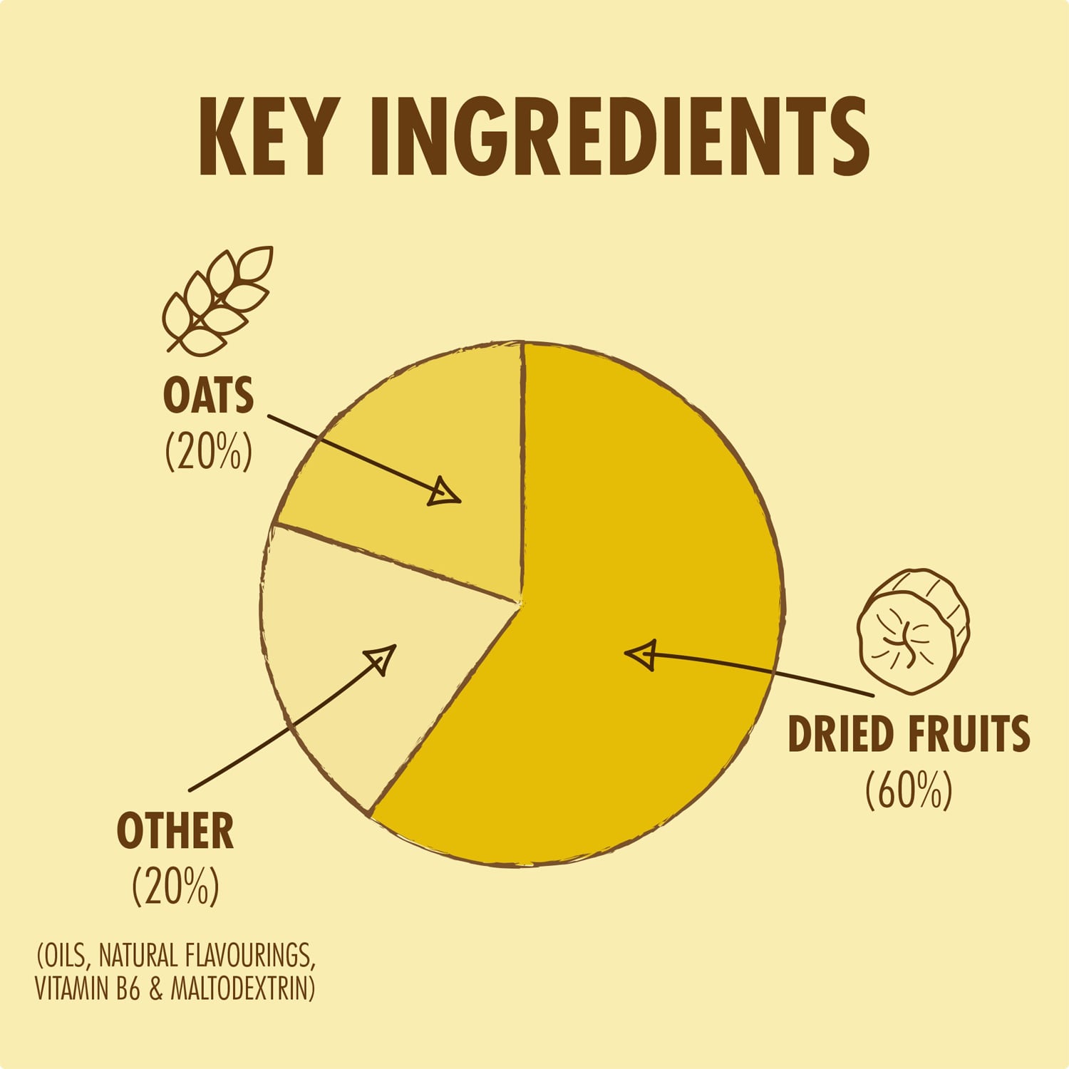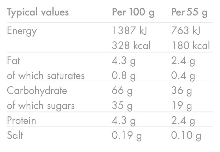 🌾 Luonnolliset ainesosat Valmistettu kaurahiutaleista, kuivatuista hedelmistä, paisutetusta riisistä ja luonnollisista aromeista.