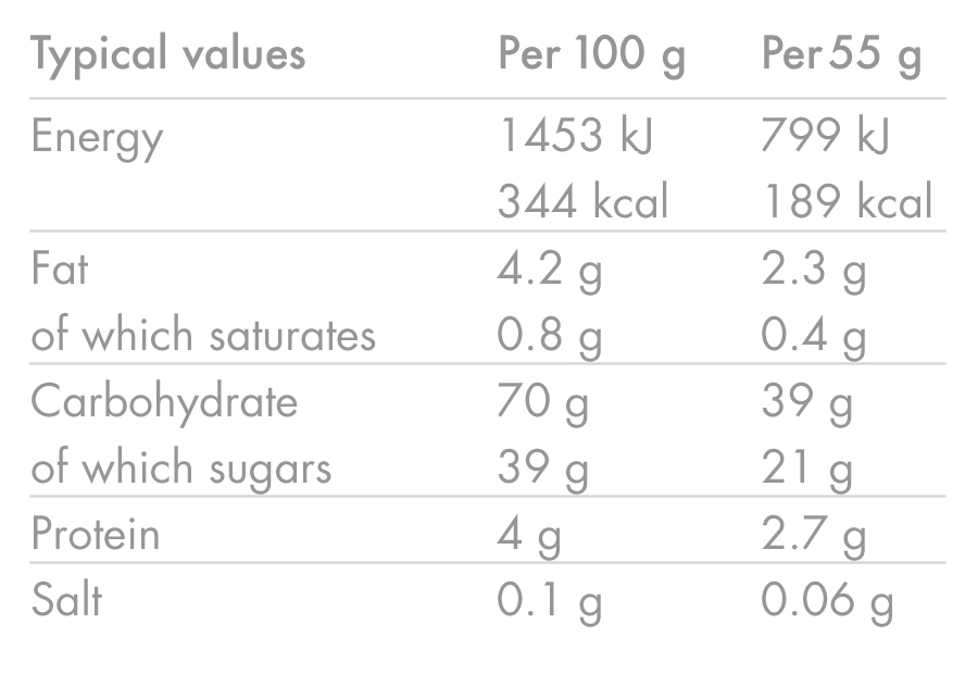 Nauti 1 patukka 30-60 min ennen liikuntaa tai 45-60 min välein liikunnan aikana, riippuen intensiteetistä. Voidaan käyttää myös treenin jälkeisenä välipalana.