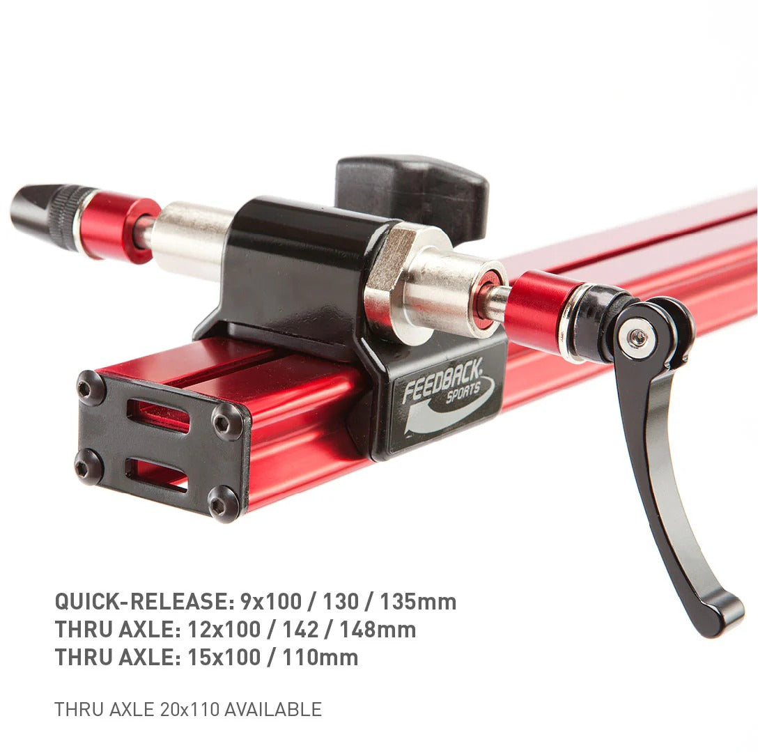 Le Sprint s’adapte rapidement à tous les vélos, qu’il s’agisse de cadres aérodynamiques de route ou de triathlon, avec des standards de montage Quick-Release et Thru-Axle. Sa plateforme rotative à 360° permet d’accéder facilement à tous les points du vélo tout en restant près de vos outils, optimisant le flux de travail pour le nettoyage, l’entretien et les réparations. Les adaptateurs fournis couvrent les axes standards : Quick-Release 9×100/130/135 mm et Thru-Axle 12×100/142/148 mm, ainsi que 15×100/110 mm pour l’avant, avec possibilité d’acheter un adaptateur supplémentaire 20×110 mm.