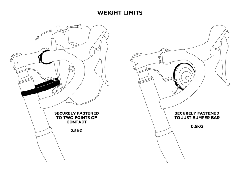 Bumper Bar on valmistettu lujasta teräksestä, jossa on kestävä pulverimaalattu viimeistely, ja siinä on etusäleikkö sekä 30 mm:n aukot ylä- ja alapuolella, jotka sopivat täydellisesti ohjaustangon pussin kiinnityshihnojen kanssa. Halkaisijaltaan 5 mm:n reiät ylhäällä ja alhaalla ovat myös mukana lisäkiinnitysmahdollisuuksia varten.