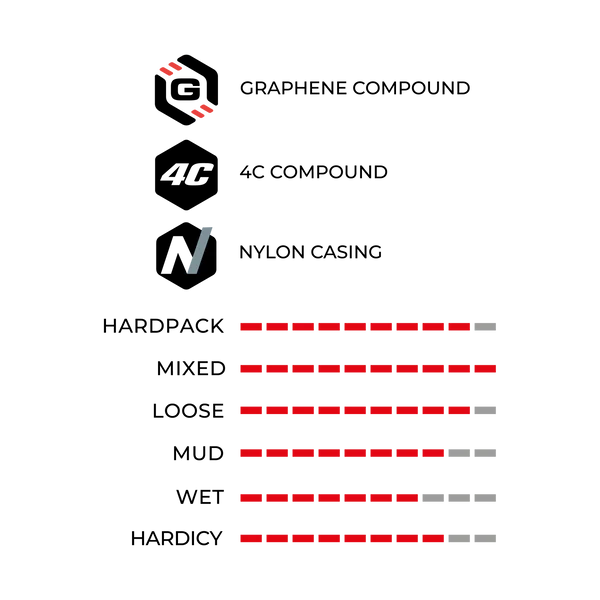 4C-profiili koostuu neljästä grafeenivyöhykkeestä, jotka parantavat kestävyyttä ja takaavat vertaansa vailla olevan pidon teknisillä radoilla. Barzo on myös suunniteltu 100 TPI XC Trail -kotelon ympärille, mikä takaa korkean suorituskyvyn. Siinä on Bead Shield -suoja varret ja Nylon-vahvistus sivuseinissä.