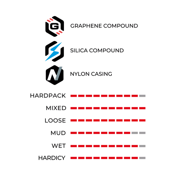 Valmistettu 1C Race -profiiliyhdiste grafeenista + piidioksidista.Mazza takaa joustavan ja sitkeän pidon. Sen Enduro Race -kotelo erittäin vahvistettua nylonia. keskusvahvistus, pistosuojaus ja sauvasta sauvaan ja vanteen iskujen aiheuttaman puristumisen esto. Siinä on myös ylimääräinen pistämisen estävä kaistalejoka antaa lisävahvuutta keskeytyksettömään ajamiseen myös äärimmäisillä radoilla.